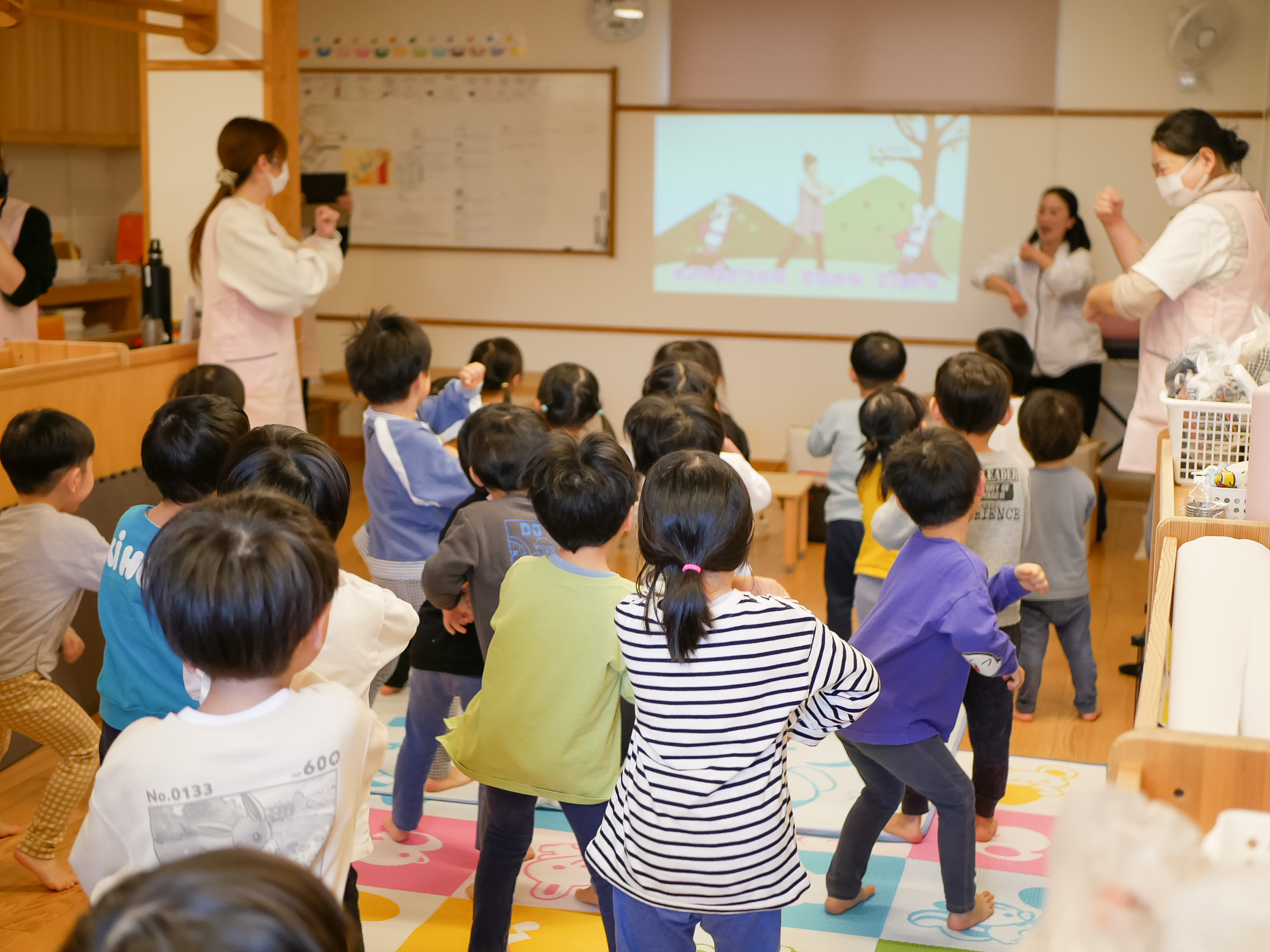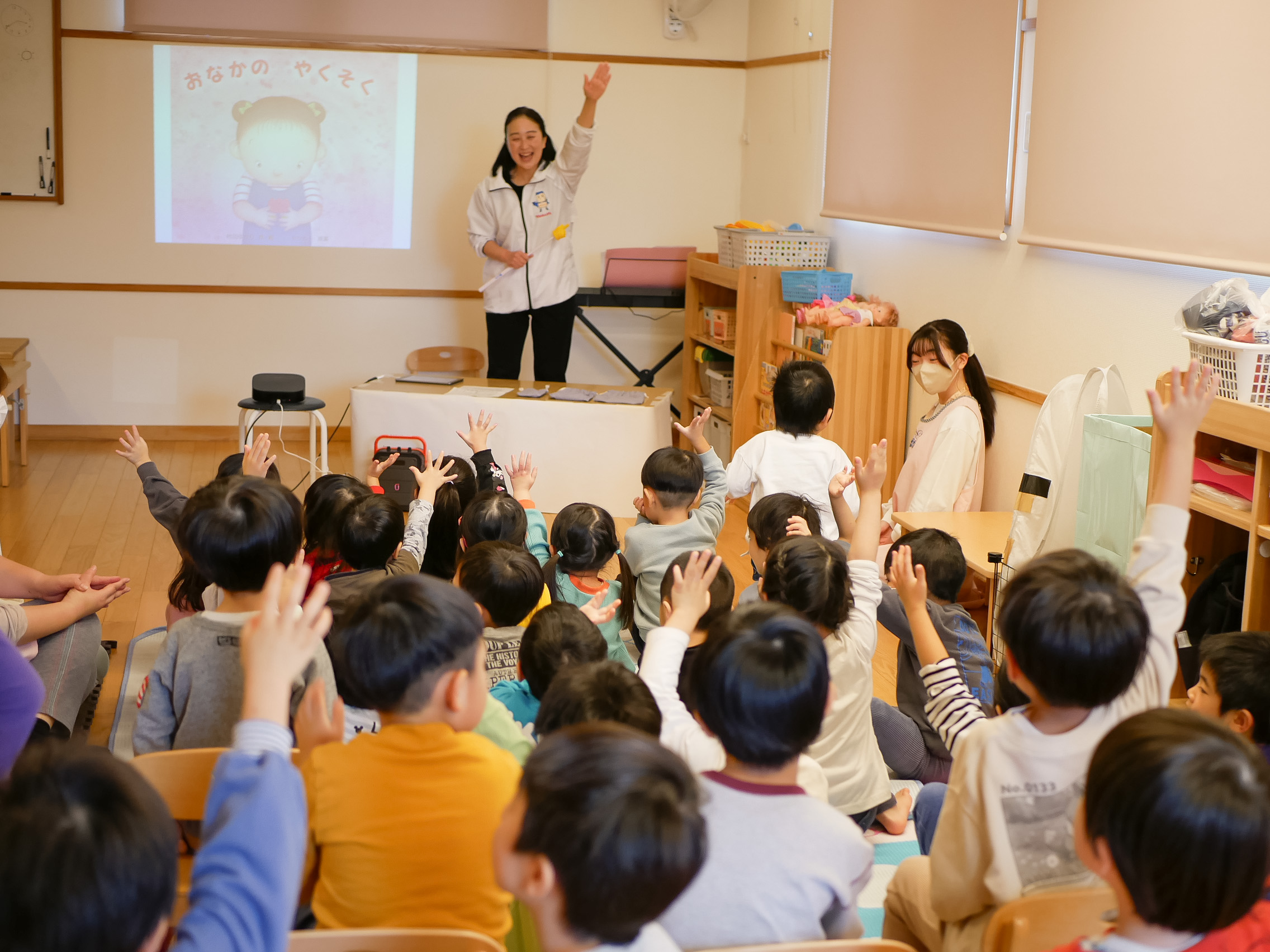 一見、子どもたちにとっては分かりづらそうにも思える生活習慣上での大切なポイントを、オリジナルのお話やお人形、体操なども交えつつ、子どもたちの目線に立ってコミュケーションを取りながら伝えていただきました。