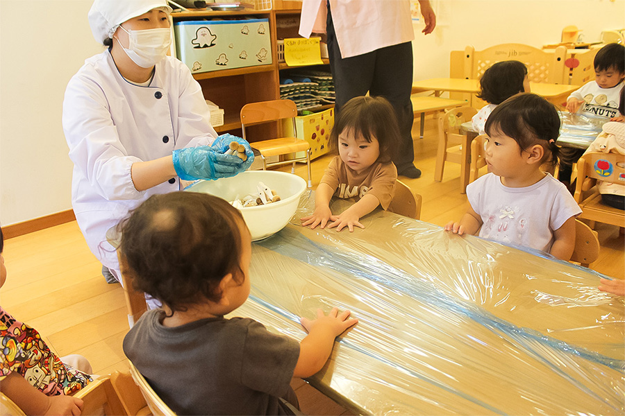 1歳クラス給食の先生とキノコさき
